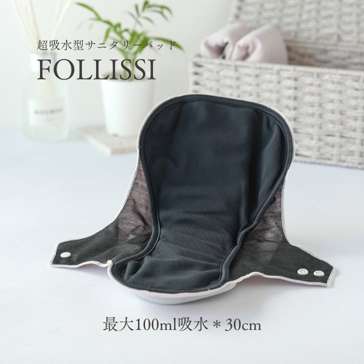 100ml吸水の吸水パッド・布ナプキン「FOLLISSI」は、多い日や夜の経血量が気になる方に安心して使えるロングタイプ。